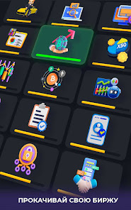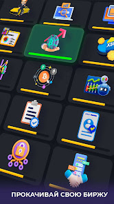 Что бы добывать всё больше и больше коинов, прокачивай все уникальные карточки, покупай акции бирж и расти в прибыли.