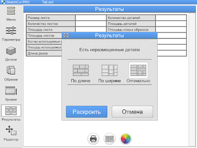 - выбор и изменение параметров раскроя (размер листа, ширина реза, отступ от края листа и т.д.);