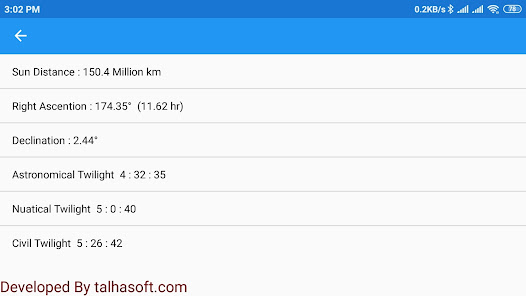 Это приложение вычисляет положение солнца, луны и солнечных планет и время для любого места на земле в любое время. Он также дает информацию о погоде, перенаправляя вас на страницу погоды с открытым исходным кодом. Он отображает продолжительность светового дня, склонение Солнца и расстояние до него, прямое восхождение, видимость Луны и планет и многие другие солнечные функции.