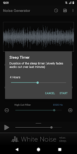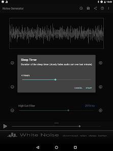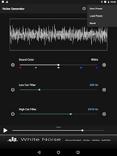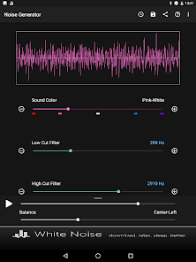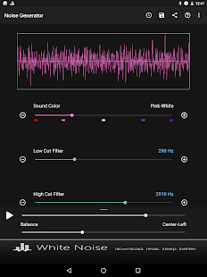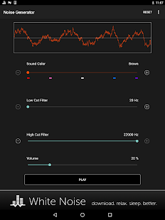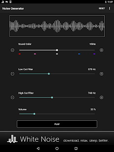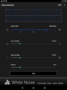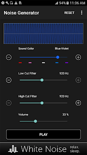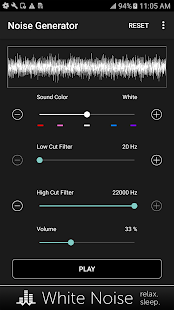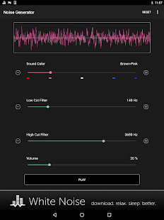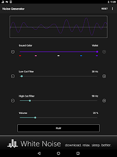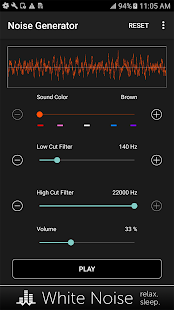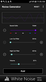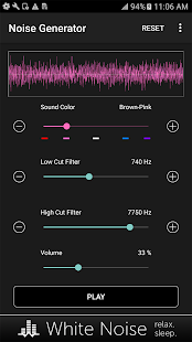 Перетащите ползунок звук цвет, чтобы выбрать коричневый, розовый, белый, синий, фиолетовый, или где-то посередине. Затем перетащите разрезанные фильтры низких и высоких для дальнейшей настройки по своему вкусу. Регулировка громкости устройства с помощью ползунка громкости на экране до комфортного уровня. Переключение воспроизведения звука с помощью кнопки Play / Pause.