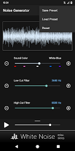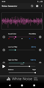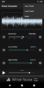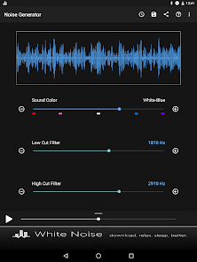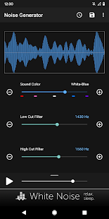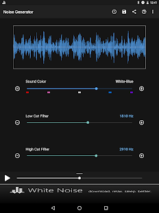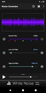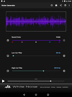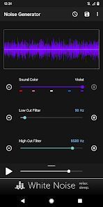 Создавать пользовательские цветовые шумы, включая коричневый, розовый, белый, синий и фиолетовый. Настройка шума за счет использования низких и высоких срезанные фильтров. Простой современный интерфейс запоминает все настройки для быстрой генерации и использует передовые математические формулы для генерации всех звуковых волн. Там нет аудио файлов, включенных в бинарный файл приложения, который держит размер приложения к минимуму и приложения производительности до максимума.