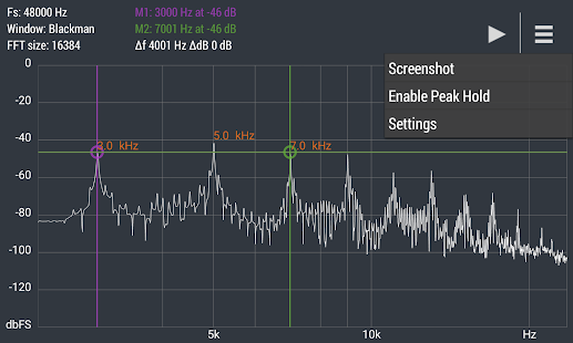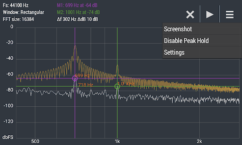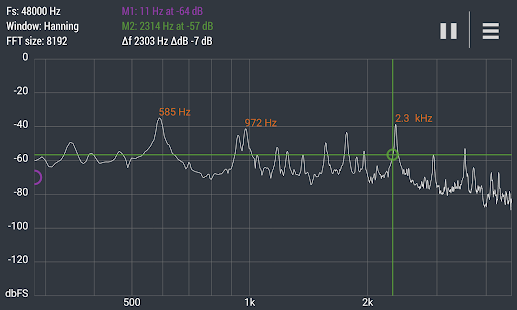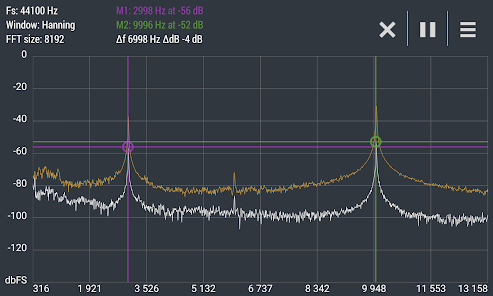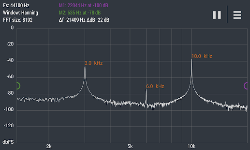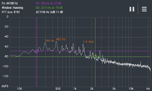 Расширенный БПФ Анализатор спектра в реальном времени (RTA) мощный аудио инструмент для визуализации и анализа сигналов от микрофона андроид устройства в частотной области.