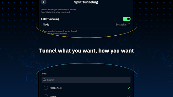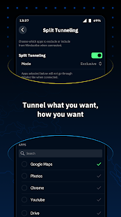 • Split Tunneling choose which apps should go over the VPN tunnel.
