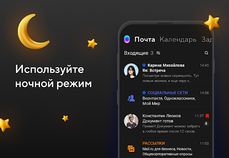 • Уведомления о новых письмах. Настройте уведомления под себя: поставьте время, выберите папки и людей или скройте превью. Уведомления не разбудят вас ночью, ведь Почта Mail ru заглушает звук во время сна.