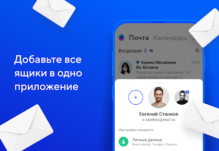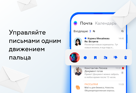 Добавьте все свои аккаунты и читайте электронную почту с ящиков на Mail.ru, Яндекс, Microsoft Outlook почта, Gmail от Google, Rambler, Yahoo и других сервисов. Отправляйте письма, записывайте дела в рабочий или личный календарь, загружайте фото и документы на диск в Облако Mail.ru. Звонки, новости и погода, голосовой помощник Маруся — всё в одном приложении!